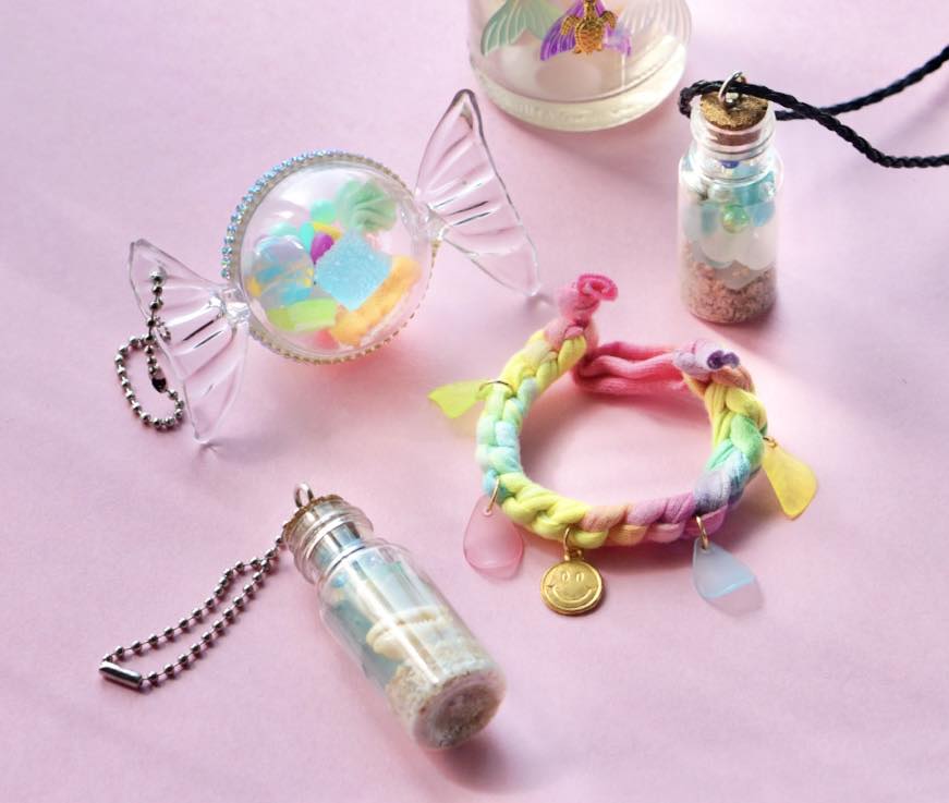 シーグラスや貝殻・ペットボトルキャップ・アップサイクルヤーンなどの素材を使用して、ブレスレットやネックレス・チャームのワークショップをおこないます。