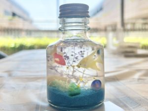 好きな貝がらやビーズを選んで、ビンの中に自分だけのアクアリウムの世界を作っていきます。