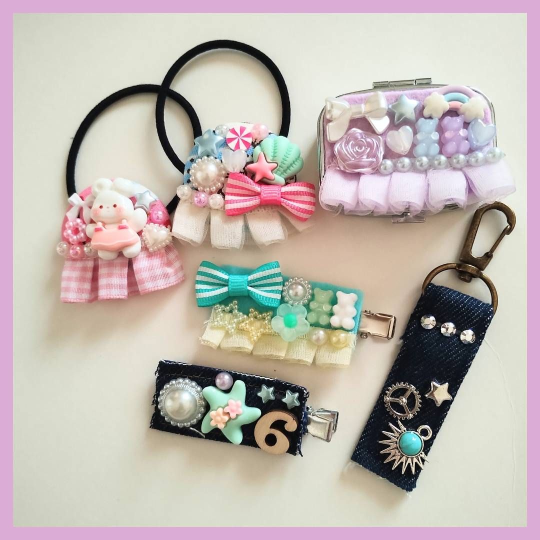 デニム・フェルトで作ったお気に入りの土台にパーツをつけ放題!オリジナルのヘアゴム・ヘアピン・巾着・アクセサリーbox等が作れます。デニム素材はカッコよく仕上がるので、男の子や大人にも大人気です!お名前や数字も入れられるので、推し活やプレゼントにいかがでしょうか?