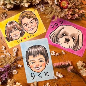 お写真からそっくりで可愛い似顔絵をお描きするので、その場にずっといなくてもOK!他のお店を楽しんでいる間に描いておきます!その場で撮るか、あなたの携帯に入っている写真からでもお描きします!