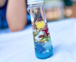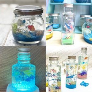 好きな貝殻やビーズを選んで、ビンの中に自分だけのアクアリウム世界を作っていきます。自由に使えるドライフラワーやモスもあるので工夫しながら作ってみてください。光るバージョンもあるので、ぜひ会場で見てみてくださいね!