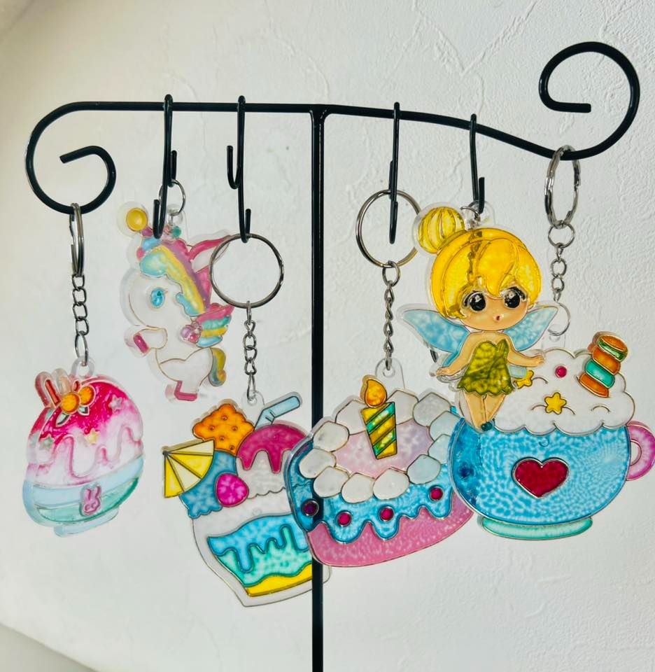 ディンプルアートキーホルダー作り:車のフロントガラスから作られた絵の具を塗ると乾くと凸凹で透け感のあるステンドグラスの様な風合いに大人もお子様もお楽しみ頂けます。
