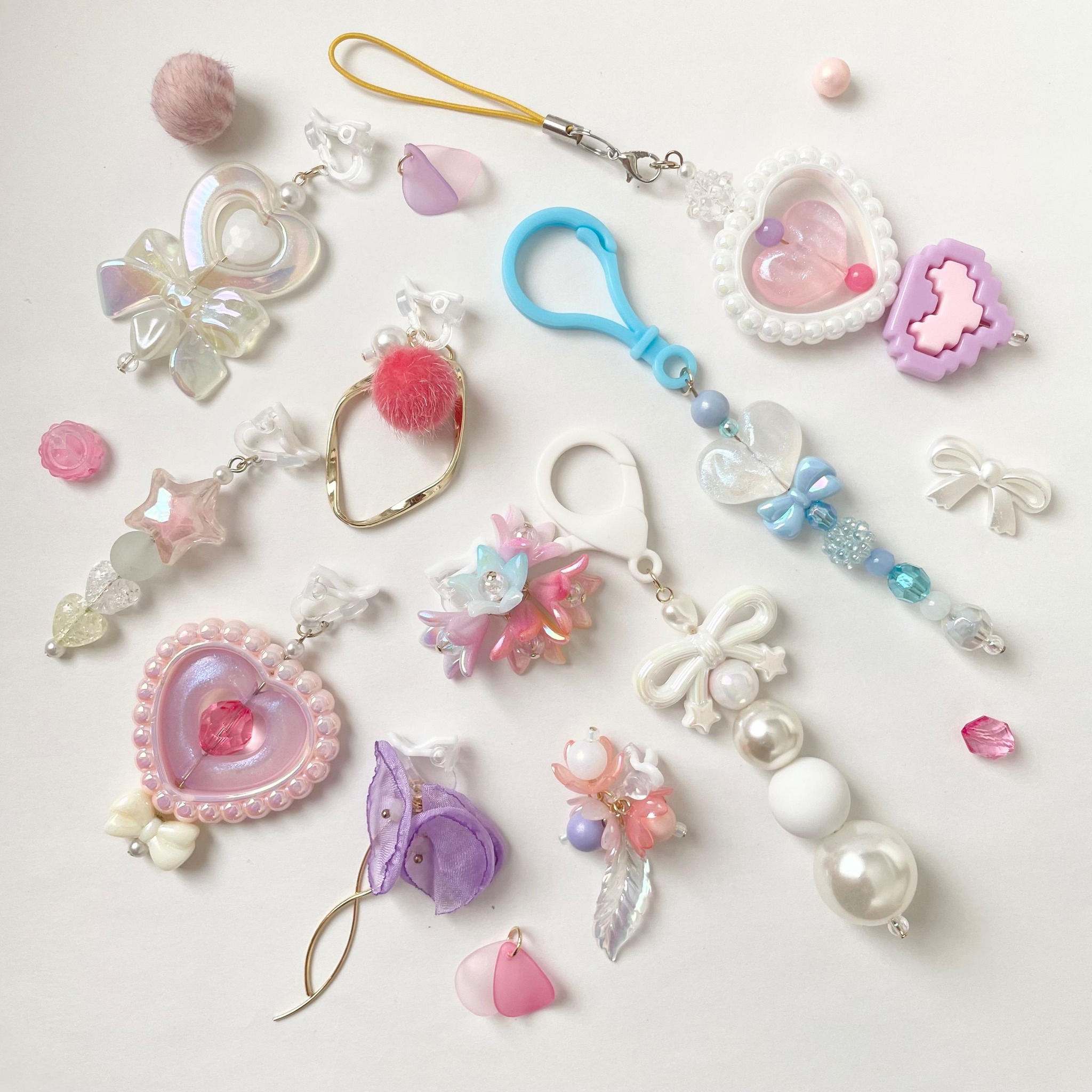 レジンで制作したキーホルダーやアクセサリーと、選んで頂いたパーツでお作りするヘアゴムを販売します。