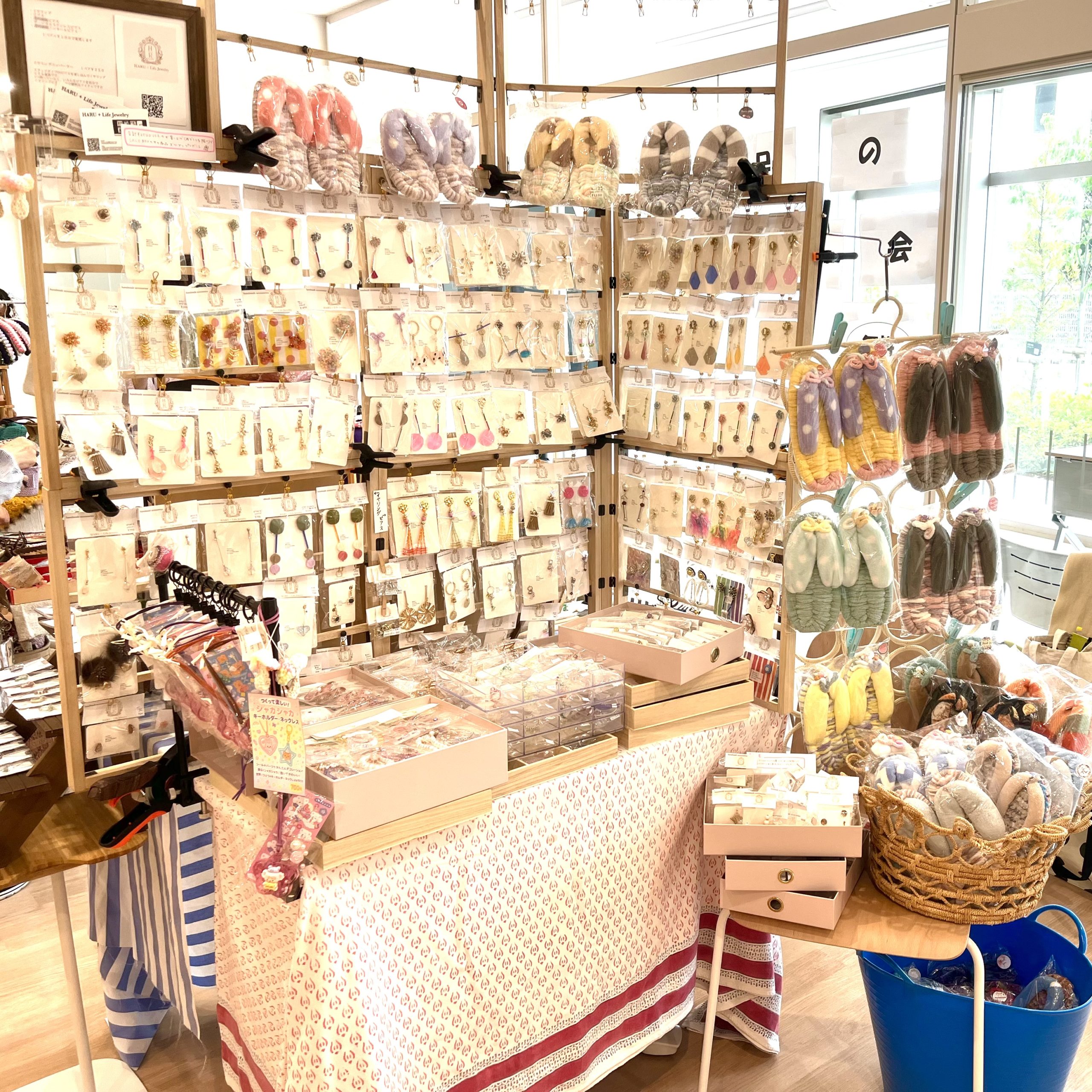 キッズアクセサリー販売¥100〜 キーホルダーやイヤリング、大人用ピアス¥300〜 もこもこキッズ布ぞうり¥2000〜 大人用もこもこ布ぞうり¥3000〜