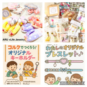 ハンドメイドのもこもこキッズ布ぞうりや、カシャカシャカラフルキーホルダー、ネックレス。イヤリング、ヘアゴムなどキラキラカラフルな小物を販売します。イニシャルオリジナルブレスレットとワインコルクで作るキーホルダーワークショップも行います。大人用ピアスやイヤリング、ヘアバレッタ等のアクセサリーもご用意していますので、是非皆さんで楽しんでいただければと思います。
