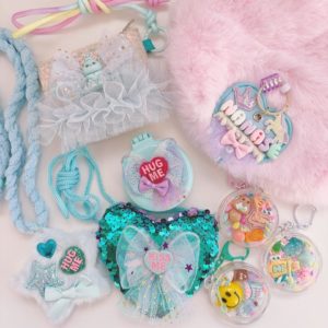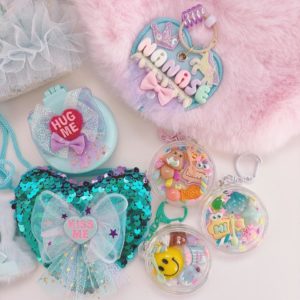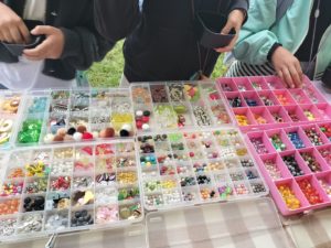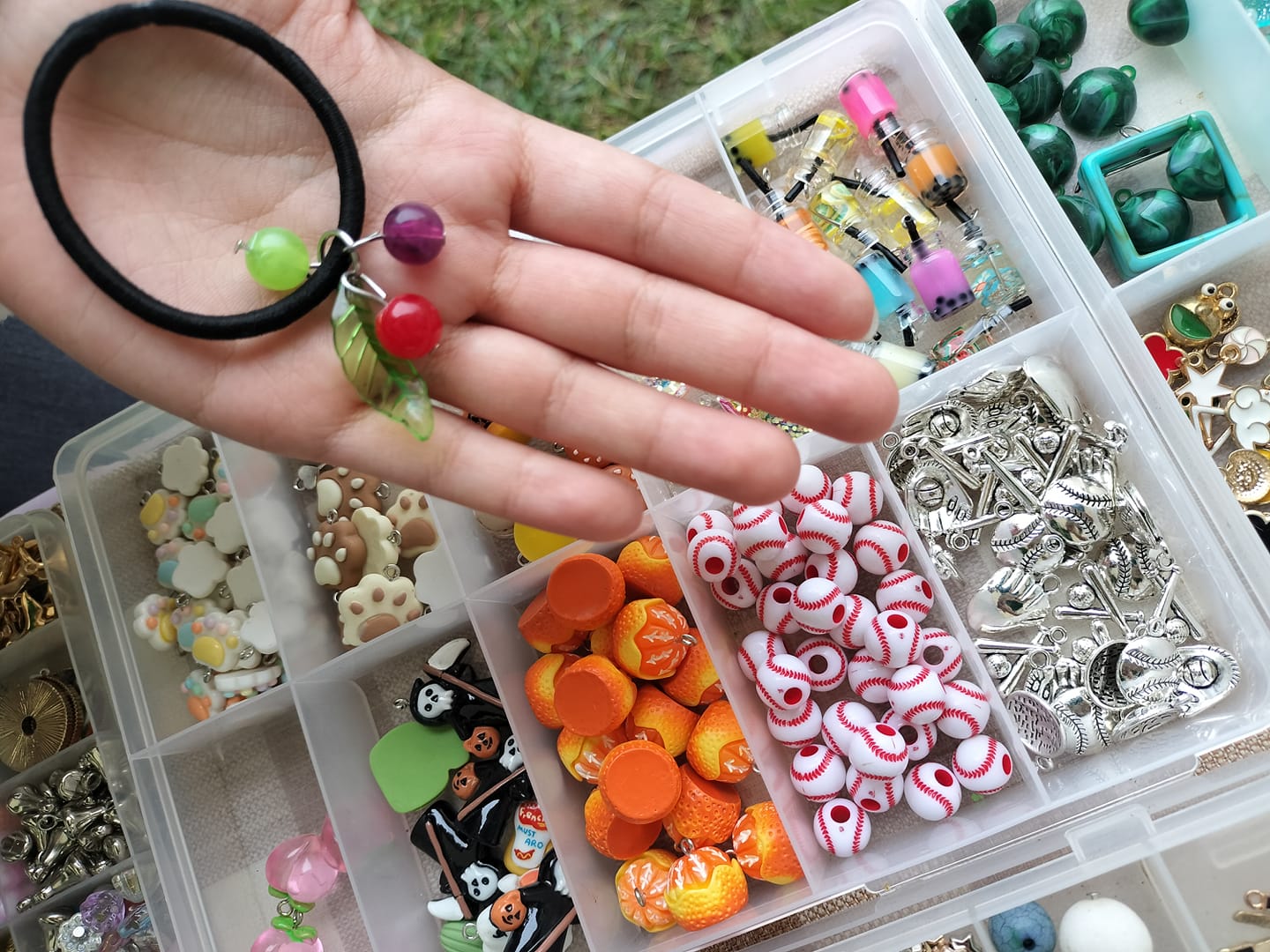 たくさんあるチャームやビーズの中から4つ選んでいただき、その場でヘアゴムをお作りします。予約不要です。直接ブースにお越しください。