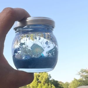 好きな貝殻やビーズを選んで、ビンの中に自分だけのアクアリウム世界を作っていきます。